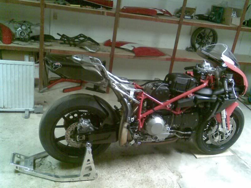 Voi olla, että tuo rungon pulverimaalaus jää väliin. Riippuu täysin siitä mitä sen irroittaminen ja uudelleen kiinnitys tulisi maksamaan, mutta luulen, että ei maksa vaivaa. Vanteet kyllä meinasin maalauttaa edelleen. Riisuttuna se pyörän originaali biposto takarunko näytti kyllä järkyttävän painavalta kasalta aivan turhaa metallia, joten ehkä se pari hunttia on irroitettava sitä alumiinista monopostoa varten.