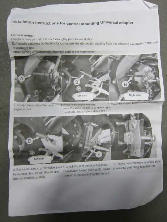 Mulla oli -06 vuotinen R6R ja Bursigin keskeltä nostava pukki. Jouduin myös kääntämään yhden moottorin kiinnityspultin, jolloin alkuperäinen holkki jäi käyttämättä ja sen tilalle tuli pukin mukana tullut holkki, johon adapterin toinen tappi sopi. Ei ollut mitään ongelmia. Pari talveakin pyörä oli pukin varassa.