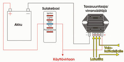 tuossa on kyllä a ja o kunnolla toimiva ja riittävästi jäähdytetty tasasuuntaaja/jännitteensäätäjä... suzukin alkuperäisellä laitteella ei kannata tehdä tuota valokatkaisijan ohitusta... siitä tulee vain ongelmia...