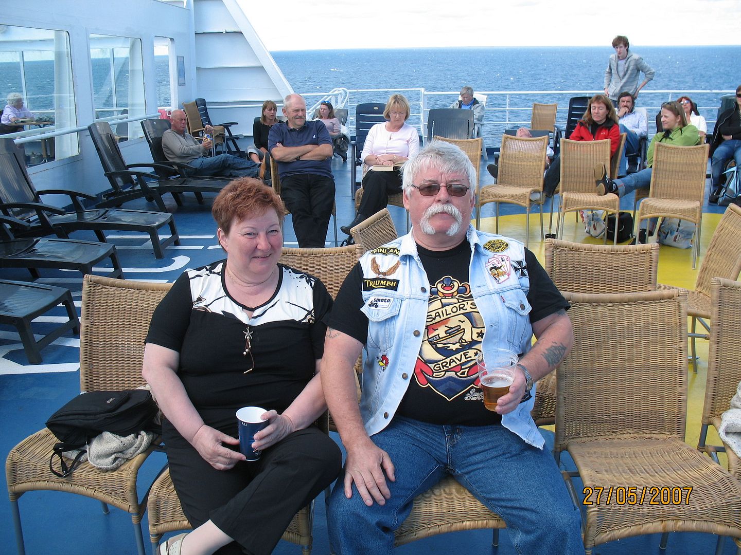 Laivarannassa oli jo iso joukko motoristeja odottelemassa. Joukossa oli jo 1 suomalaispariskunta ja laivassa tapasimme vielä toisenkin, myös Rocketilla ajavan pariskunnan. Melkein kaikki motoristit olivat matkalla Man-saaren ajoihin. Laivalla oli kaiken kaikkiaan n. parisataa motoristia eri maista.