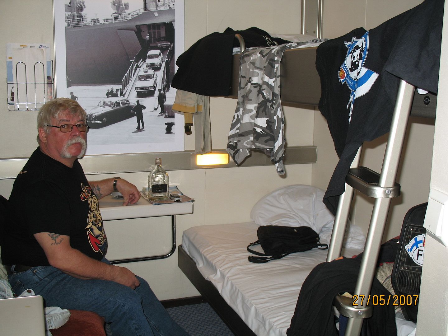 Väsyneinä mutta onnellisina väännyimme hyttiimme ja suihkun jälkeen yökaljalle. Ruokaa emme kaivanneet vaan jano oli tyydytettävä. Laiva oli pelkistetympi kuin ruotsinlaivat mutta ihan riittävä motoristille. Huomasin laukkuni avattuani sen mielenkiintoisen seikan että täysi Linna-shampoopullo oli purskautellut sisältönsä laukun sisään ja t-paidat kuten sukatkin olivat shampoossa. Tällaisessa pullossahan on kiertyvän korkin lisäksi kätevä peukalolla painettava kansi, ja pullo oli tietenkin töyssyissä ruikkinut sisuksensa laukkuun. Nyt tuli kiire. Vaatteet oli huuhdottava ja saatava kuivaksi ennen Englantia.