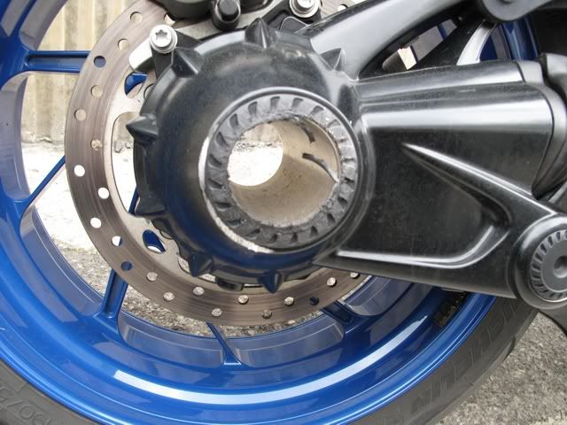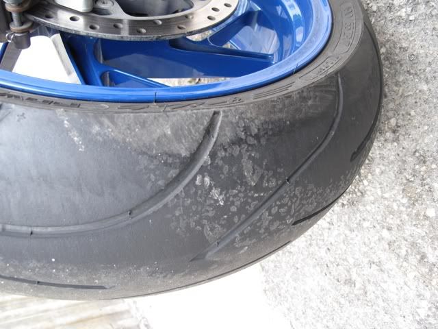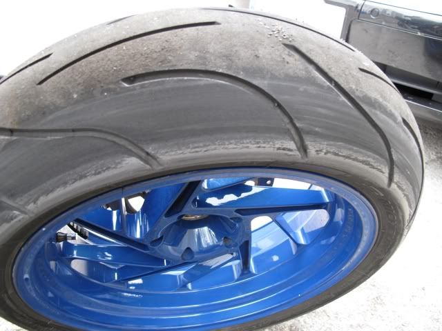 Takarenkaan vasemmassa reunassa on tuommoinen jurmu. Tuo on täytynyt tulla auton pökkäisystä, koska kaikki muut vauriot ovat mopon oikealla reunalla. Kun ajoin kaistan oikeassa reunassa, nin se on tökännyt tuohon renkaan vasempaan reunaan: