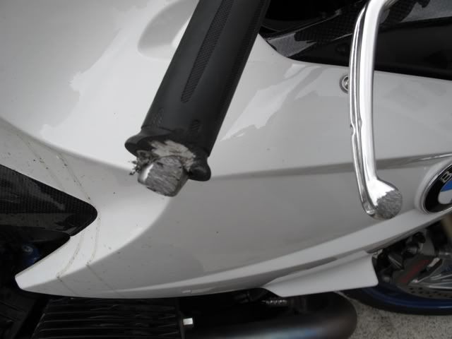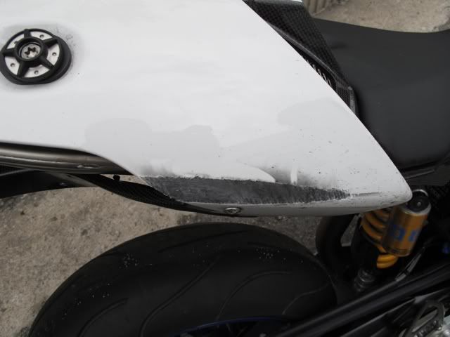 Ei ollut erillistä selkäsuojaa, vain puvun selkätaskussa oleva suoja. Ei myöskään ollut aurinkolaseja. Kävin katsomassa mopoa ja aika hyvältä se näytti. Oikea venttiilinkoppa on säpäleinä, mutta ei tiedä koneistosta vielä mitää. Ehkä se sitten tämähti tuohon rotvallin reunaan. Kaikki vauriot ovat oikealla puolella. Etukate on muuten ok, mutta yläosasta on hioutunut pari senttiä kulmasta pois. Alakate on ihan ehjä. Tankin katteeseen tuli pieni nirhauma, mutta se on maalatulla alueella ja varmaan menee maalaamalla. Takakate menee uusiksi, kun kyljestä hioutui hiilikuitua pois. Rekisterikilven teline on murtunut. Perämurikka on kanssa vähän naarmuilla. Harmi sinänsä, koska tuo ikuinen ja täydellinen perämurikka ei muuten olisi joutunut rikkoutumistilastoihin. Taisi olla kolmas perä kun saan laahattua ruvelle. Muutenhan noita ei saa rikki millään, jos vaan öljyt vaihtaa. Täytyy laittaa noihin liukupalat suojaksi. Kaasukahvan pää, jarrukahva ja jarrunestesäiliö menevät uusiksi. Taitaa tuosta vielä mopo tulla.