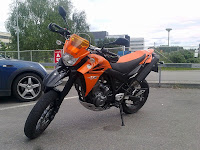 Vähän veivaamista vaativien pätkien jälkeen huomaa aina niskojen kipeytymisen, joka kielii hartialukossa ajamisesta. Varmuus puuttuu vielä, sen verran erilainen vietävä Yammu on. Nyt on löytynyt ajotyyliin muutos, sillä mutkaan taittaessa tällainen "supermoto" selkeästi vaatii kuskin painopistettä enemmän eteen, eli sinne stongan päälle.