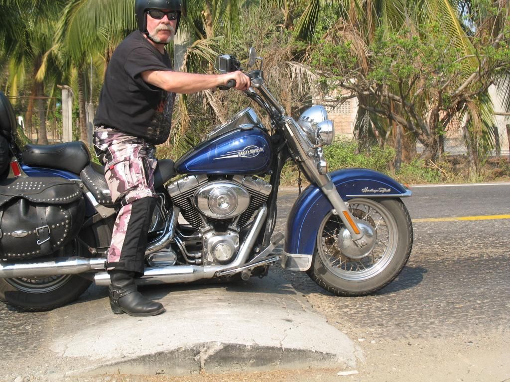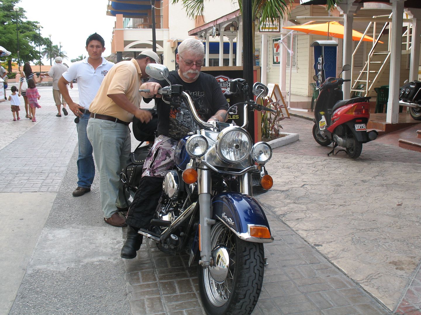 Nopea alus vei meidät Cozumelille ja heti rannassa oli vastaanottokomitea joka vei meidät suoraan Eagleridersin toimipisteeseen. *Se oli varsin vaatimaton verrattuna aikaisemmin jenkeissä näkemiimme. Esitteillä oli ainoastaan 1 kpl Road King jota kylläkin paikalliset sekä turistit kuolasivat estottomasti. Mr. Omar oli paikalla ja paperisota sujui hetkessä. Pian kuuluikin talon takaa tutunoloinen sytkytys. Sieltähän se Heritage tuotiinkin näytille. Olipa taas pienen pettymyksen paikka. Pyörä oli 2004-mallia ja päällepäin aika huonosti pidetty. Pyörästä puuttui pleksi, kaatumarauta, tarakka, vaikka vuokrasopimuksen mukaan ne piti kaikki olla mukana.