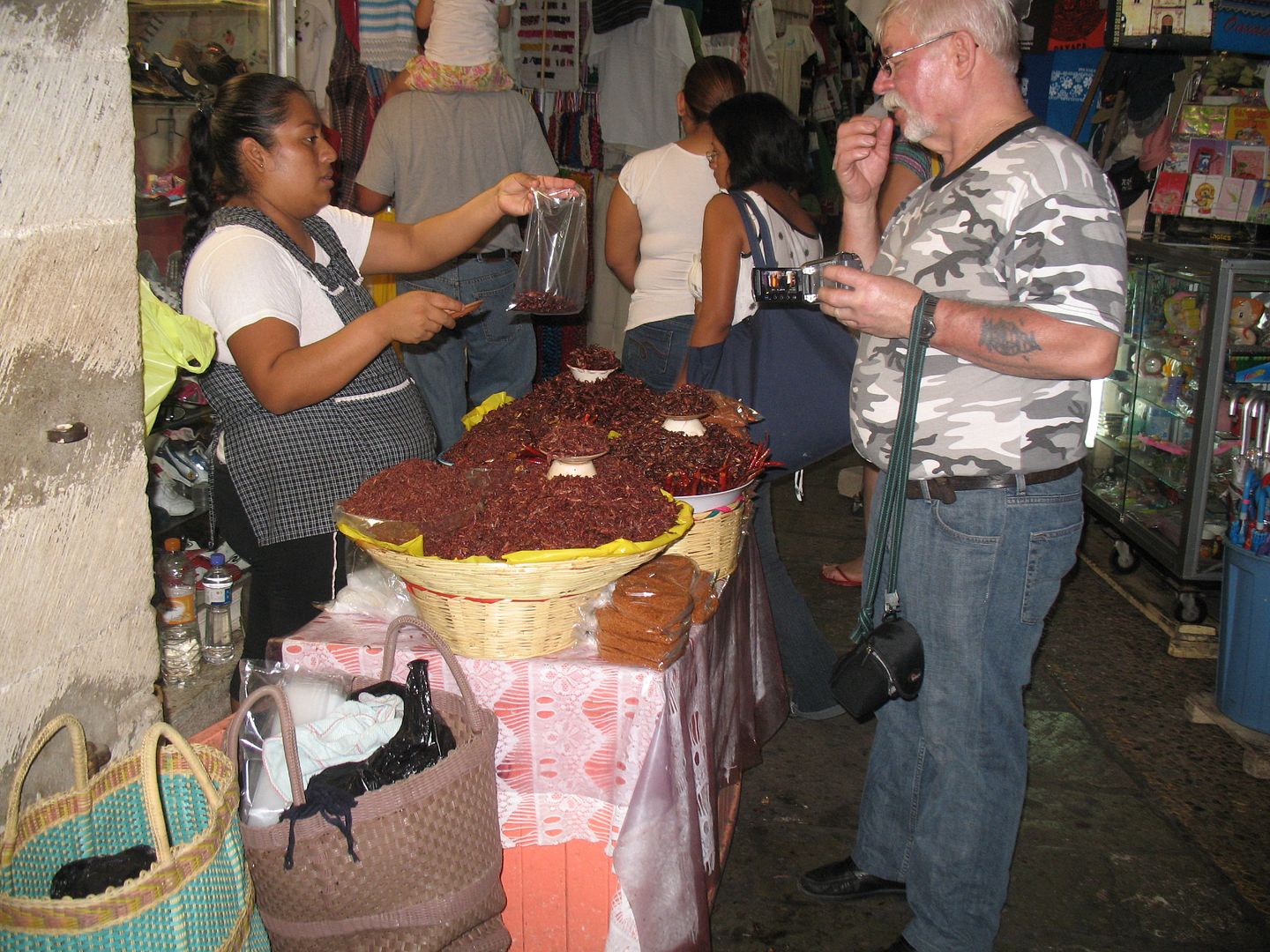 Oaxaca on myös merkittävä chilin, tuon kansallisherkun tuottaja. Chiliosastolla oli näitä erilaisia chilejä sitten pinoissa, kasoissa, torneissa, säkeissä, pusseissa, purkeissa, narusta roikkumassa jne. Oli eri kokoisia, värisiä ja näkoisiä chilejä sulassa sovinnossa. Aromi tuntui selvästi silmissäkin.