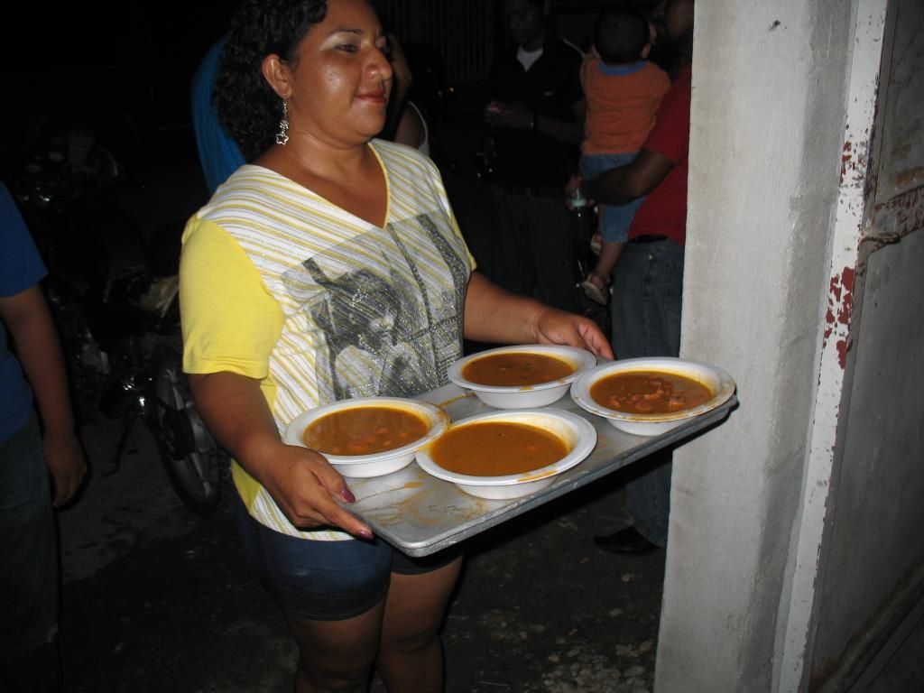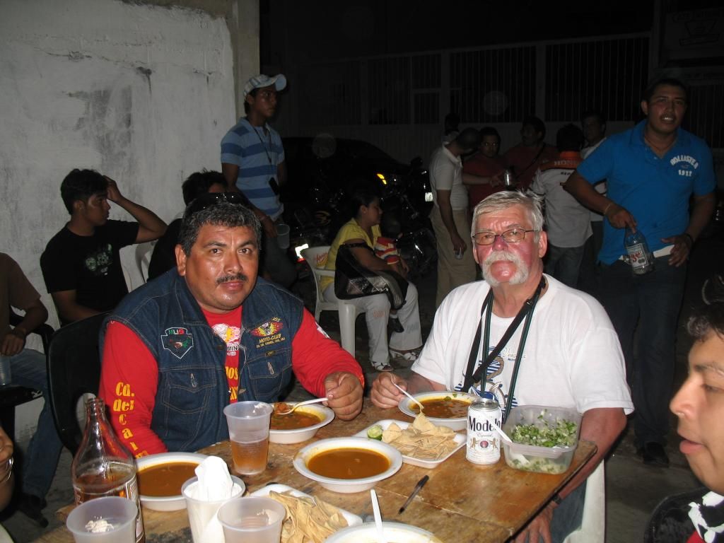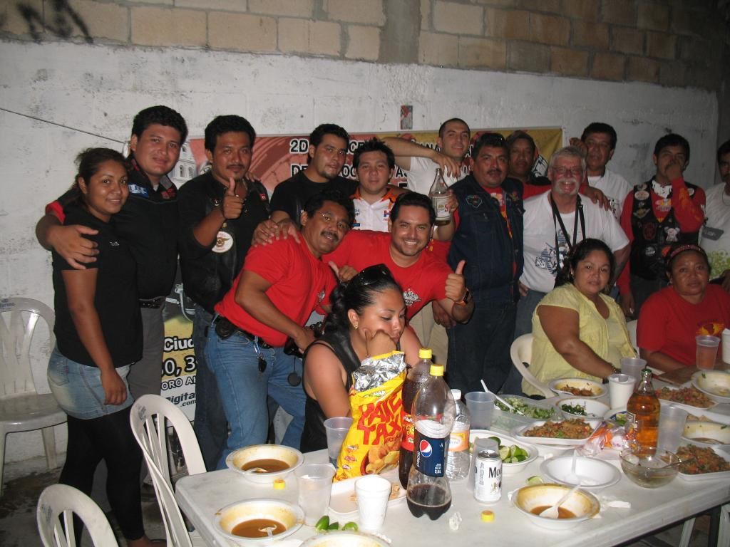 Sitten tuli eräs motoristi juttusille ja kutsui minut kerholleen iltaa viettämään. Mikäs siinä. Pyörät pärähtivät käyntiin ja minä viimeisenä yritin pysyä perässä. Olikin melkoista pujottelua. Ensimmäisen kerran tällä matkalla autot pysähtyivät sovinnolla eivätkä kiilanneet. Kerhotila oli varsin vaatimaton meidän mittapuiden mukaan, mutta ei se mitään. Paikalla oli n. 30 motoristia joista osa naisia. Tarjolla oli meksikolaista makkarakeittoa ja olutta.