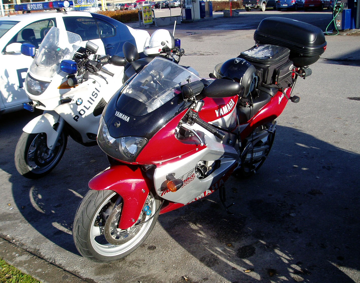 Kirjoitti meinaan siinä samalla pikavoiton... FZ-1 kokokatteella. Turussa pyörii myös saman harmaan värinen R-1 malli poliisi.