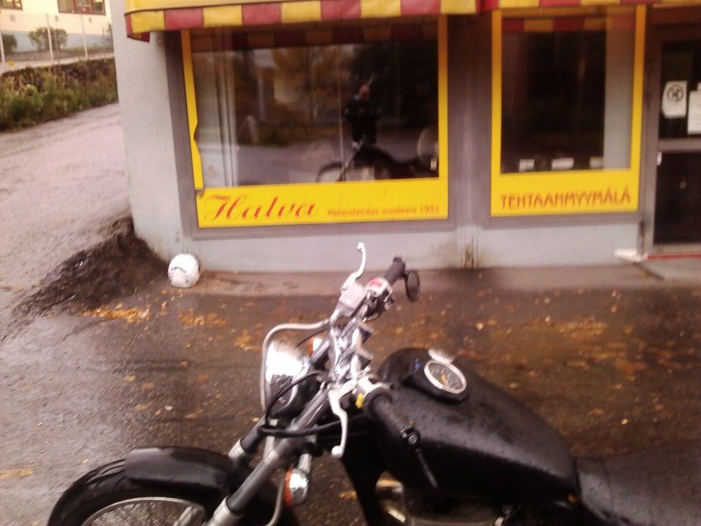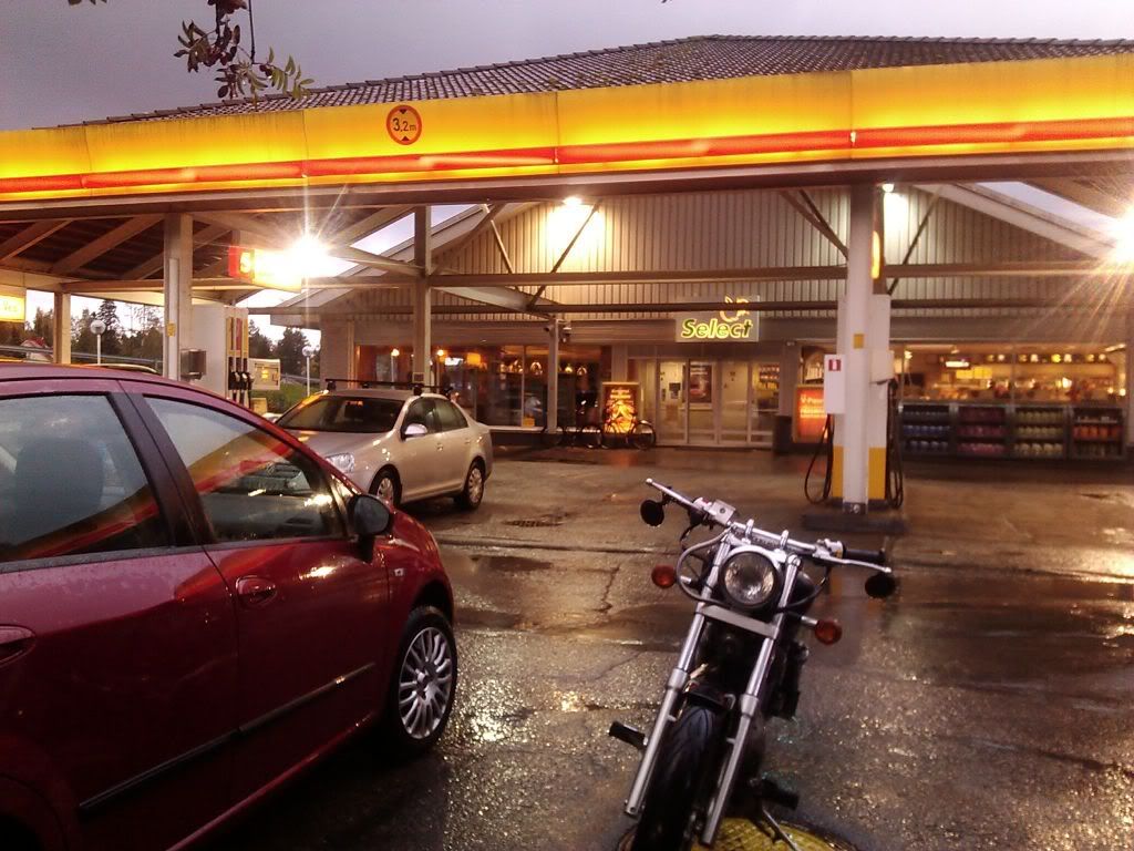 Tämä ystävällinen paikka tarjosi kahvia ja myötätuntoa kun astelin sisään vettä valuvana, tankkauspoika jopa tarjosi mopolle paikkaa katon alta, mutta suomalainen mies ei sellaista hyväksy vaan vie sateeseen et saa jahtikuvan.![]()