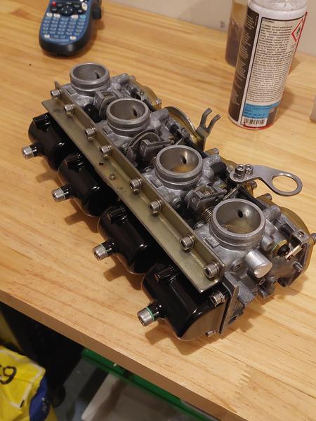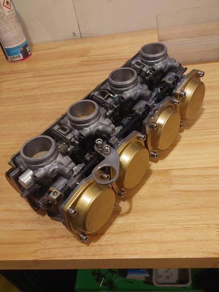 Päätin myös ehostaa kaasuttimia ulkoisesti maalaamalla kohokammiot mustalla moottorimaalilla, sekä kalvojen kannet kultaisella vannemaalilla. Lopuksi kaasarit puhtailla osilla nippuun, ja paikoilleen koneeseen puhdistetun imukotelon kanssa.
