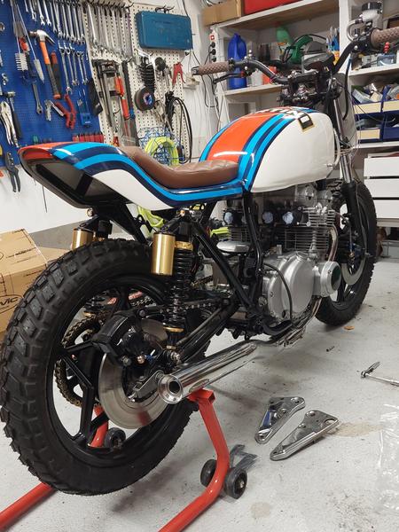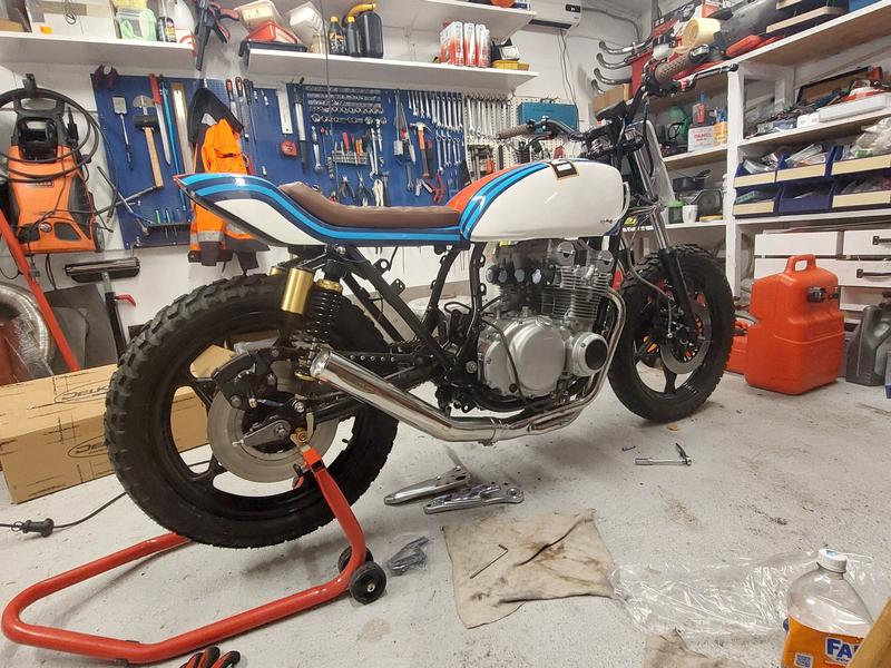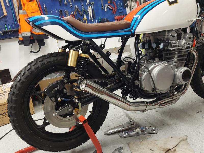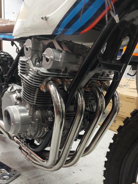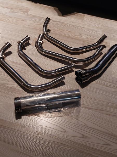 Delkeviciltä löytyikin tähän pyörään täydellinen 4-1 RST putkisto suoralla vaimentimella, joten sellainen laitettiin Englannista tilaukseen. Tavara saapui nopeasti perille, ja laatu tuntui olevan omaan silmään ensiluokkaista. Saumat ovat siistejä, ja pinnat virheettömiä. Putkia piti tietenkin heti päästä mallaamaan paikoilleen, ja ne myös sopivat moitteetta. Kiinnityslaipat kiinnitin kuparimuttereilla.